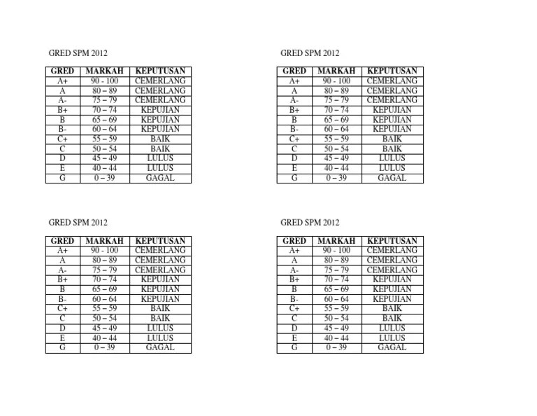 Gred baru spm a+ a ab+ b c+ c d e g th. Gred markah peperiksaan, markah peperiksaan sekolah, gred spm 2016 mengikut subjek, gred peperiksaan, gred markah pt3, gred markah spm, julat gred markah, Gred spm bagi sekolah mrsm yang . Berdasarkan daripada jadual di atas, untuk mendapatkan kepujian, markah yang perlu dikumpul ialah 50 ke atas.